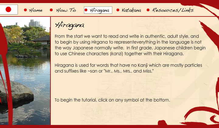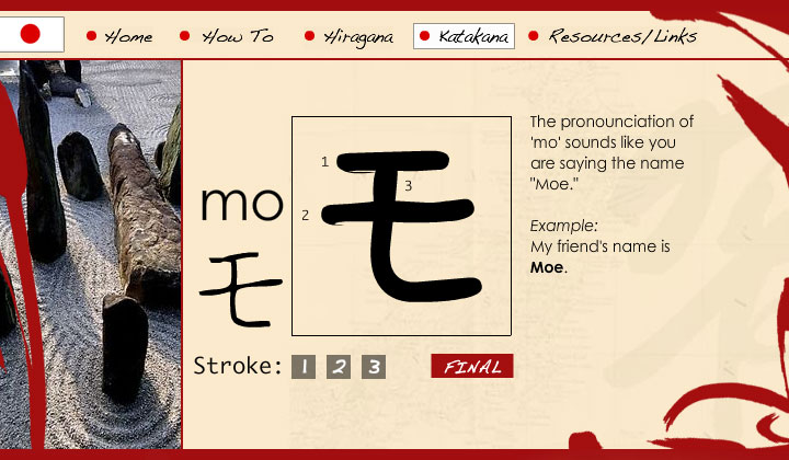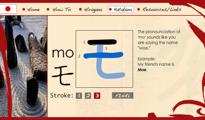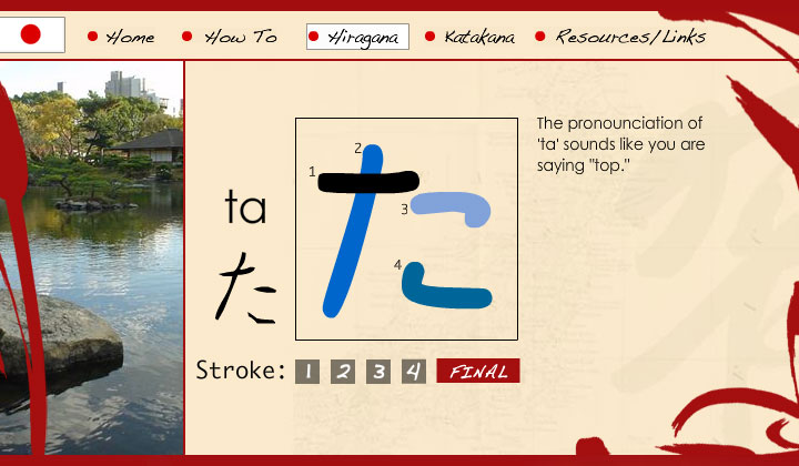 This project is an e-learning application that allows the user to view tutorials on the two fundamental Japanese writing systems: hiragana and katakana. Users can choose the system and then pick a character to begin the tutorial. Each of the characters includes buttons to view each stroke (which is indicated with a number and a color to differentiate between the strokes) and a 'FINAL' button to view the character in all black. This project was created from scratch in Adobe Photoshop and Adobe Flash.